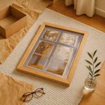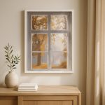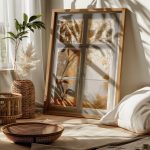Ahşap çerçeve + bej duvar → doğal ve sıcak kontrast