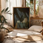Minimal soyut tablo - ahşap çerçeveyle yatak odasında