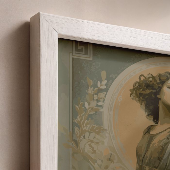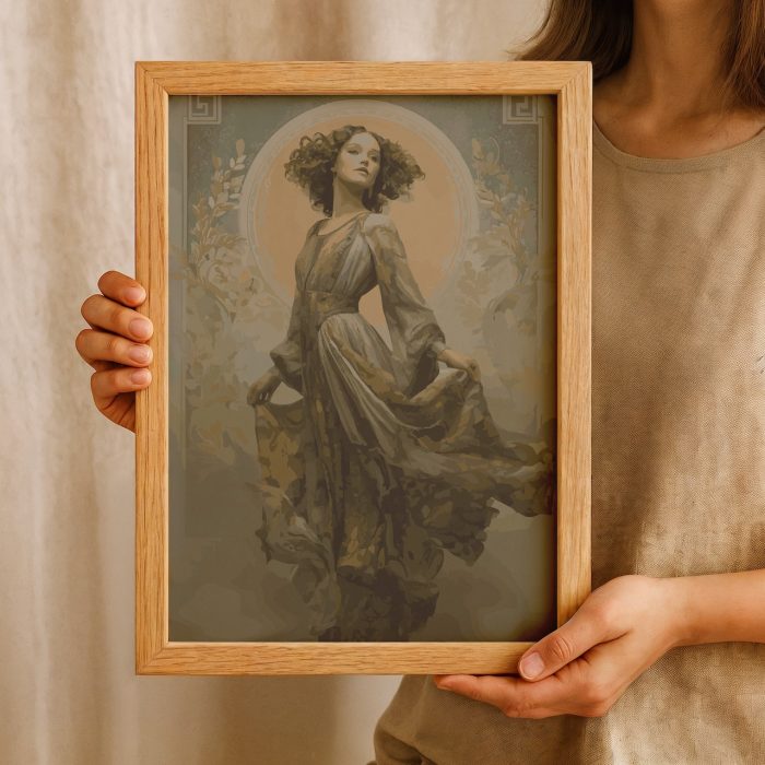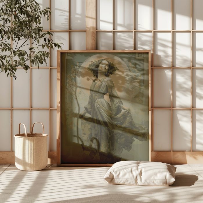 Rüzgârın Fısıldadığı Kadın, doğanın döngüsünü ve mevsimlerin değişimini simgeler. Alphonse Mucha’nın stilini yansıtan bu eser, rüzgârın ve mevsimlerin gücünü ve sessiz tanıklığını bize taşır. Her esinti bir hikâye fısıldar, her mevsim farklı bir duyguyu uyandırır.