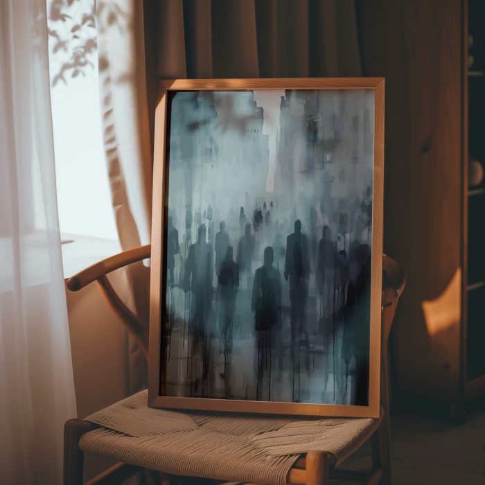 Sessiz Kalabalık, her biri kendi iç dünyasında kaybolmuş bireylerin oluşturduğu bir topluluğu betimler. Bu tablo, sessizlik içinde birbirine bağlanmış ama bir o kadar da uzak olan insanları konu alır. Yüzler, birbirine dokunmadan geçen yaşamları temsil ederken, her birey bu dolu ama boş dünyada kendi rengini kaybetmiştir. Ortadaki figür ise bu sessiz melodinin içinde kaybolmuş bir insanı simgeler.