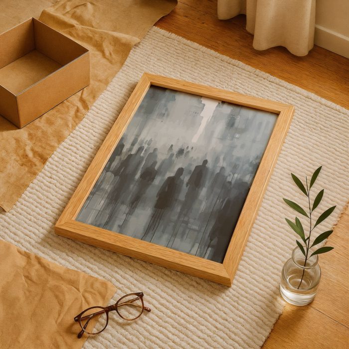 Sessizlikler içinde kaybolmuş bir kalabalığın hikâyesi bu. Her biri kendi iç dünyasında boğulmuş, konuşmayan ama çok şey anlatan yüzlerin hikâyesi. Sokaklarda, meydanlarda, kafelerde yan yana, dip dibe ama bir o kadar da uzak… Herkesin kendi sesini duymaya çalıştığı bir dünyada ortak bir sessizlikle gizlice bağlanmışlar. Bu kalabalık, birbirinin varlığını hissetse de duvarlar örmüş aralarına. Aralarındaki mesafe, aslında hiç de büyük olmayan ama aşılmaz gibi görünen bir boşluk. Birbirlerine dokunmadan, iz bırakmadan geçerken hayatın içinden, ortak bir melodiyle titreşiyorlar. Her birey, kendi evrenini yaratmış, kendi rengini kaybetmiş bu dolu ama boş dünyada. Tablonun ortasında ise, bu sessiz melodinin içinde kaybolmuş tek bir insan. Onun sessiz çığlığı, kaybolmuş rengini arıyor. Bir renk patlaması, bir hareket, bir yaşam işareti. Kalabalığın içindeki yalnızlığın, hepimizin içinde yankı bulduğu bir hikâye.