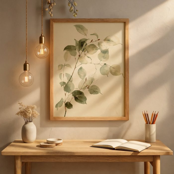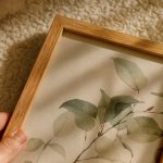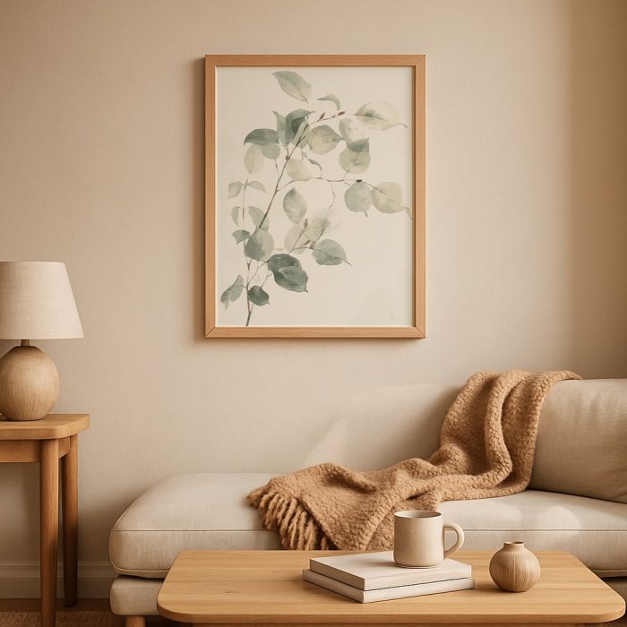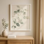 Beyaz çerçeve + beyaz panel duvar + eukaliptus demeti → ferah minimal vurgu