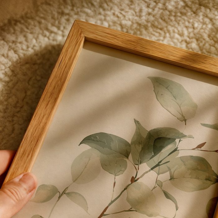 Ahşap çerçeve + bej duvar → doğal ve sıcak kontrast